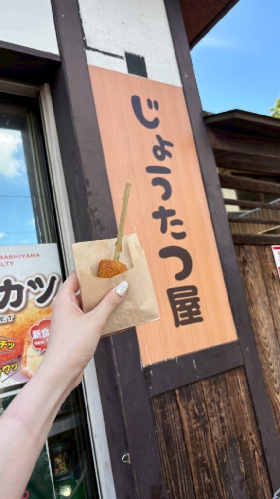 研修の前乗りをして、同期と2人で嵐山観光をしました。食べ歩きをしたり、嵐山限定のお土産を買ったり、あちこちで写真を撮って回りました。移動中はとても暑く、嵯峨嵐山駅から渡月橋、竹林までひぃひぃ言いながら頑張って歩きました。