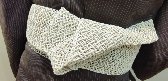 珍しいマクラメ編みの角帯を手に入れました。植物繊維を手で編んで角帯にしています。
