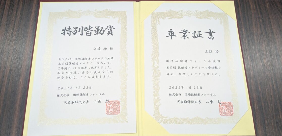 実は以前も一度卒業しているのですが、その際はカリキュラムの途中でコロナ禍が始まり、不完全燃焼の思いが残っていました。そこで再受講を決意し、今回は全講義に出席し、特別皆勤賞をいただくことができました!