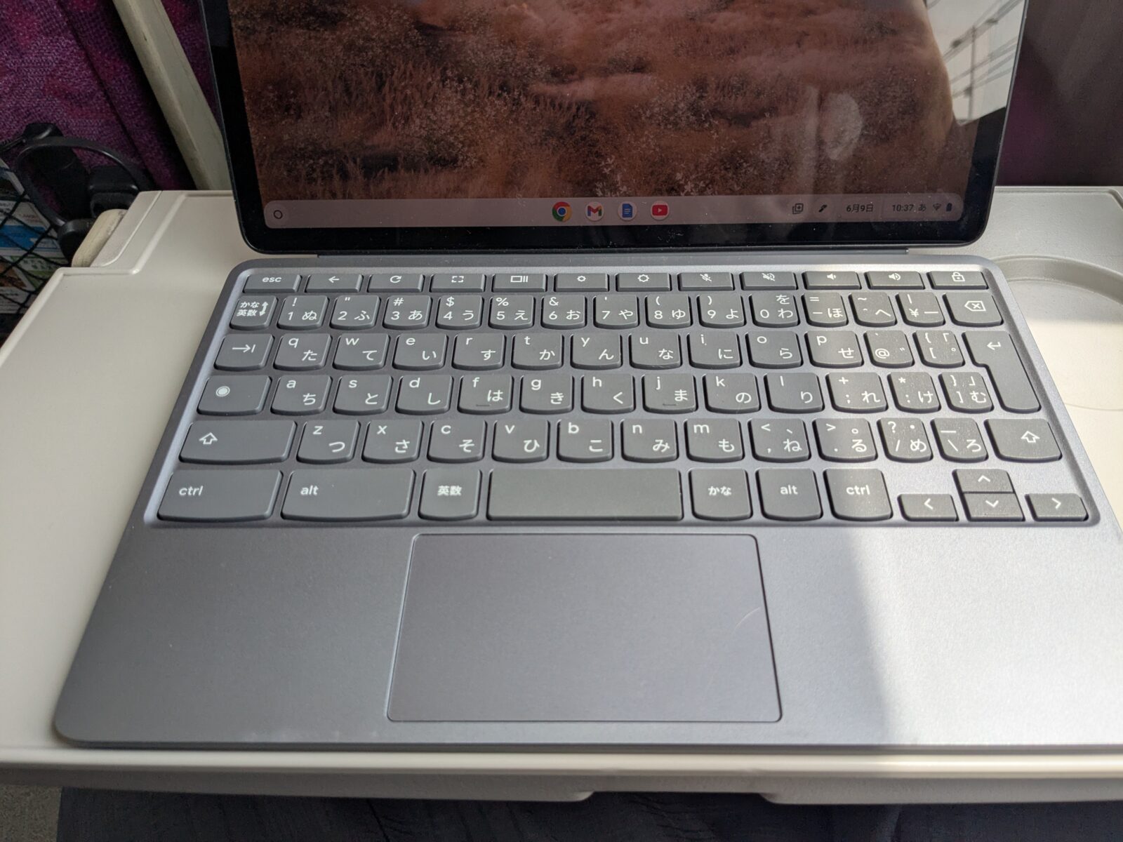 写真は、僕が出張で持ち歩いているChromebookです。以前このブログでも紹介したのですが、この機種は画面を立てるためにカバーを広げるタイプで、PCスタイルで使うにはテーブルの奥行きが必要です。
