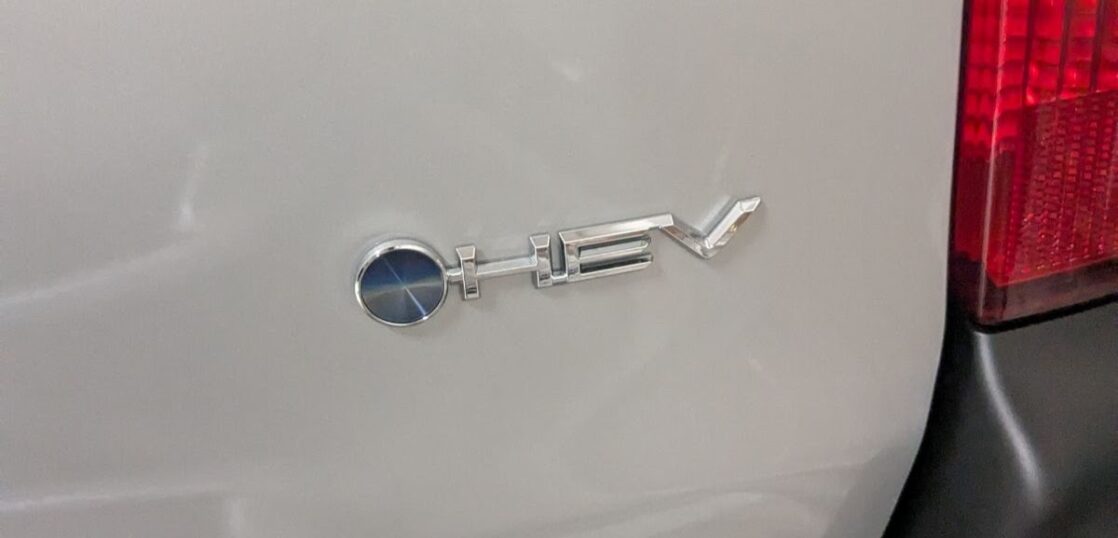 外観はこれまでの車とほとんど変わらず、後ろに小さく「HEV(Hybrid Electric Vehicle)」のマークが付いているくらいです。乗り心地も大きく変わりませんが、静かで燃費がよく、営業車としてはありがたい存在です。燃費はスペック値だと1Lのガソリンで22.6kmも走れるそうです。日本車の燃費性能の高さには驚かされます。