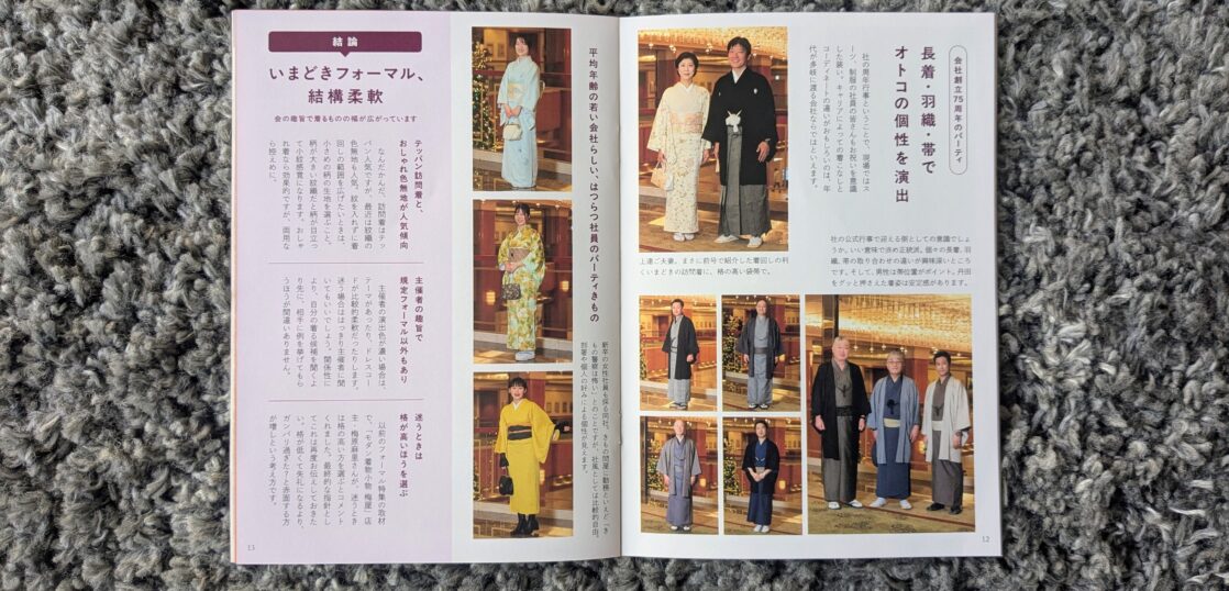 今月号のテーマは「いまどきのフォーマルきもの事情」。その流れの中で、丸上の75周年パーティーを取り上げていただいています。会場での様子だけでなく、社員の写真もたくさん掲載されていて、改めてあの日のことを思い出しました。