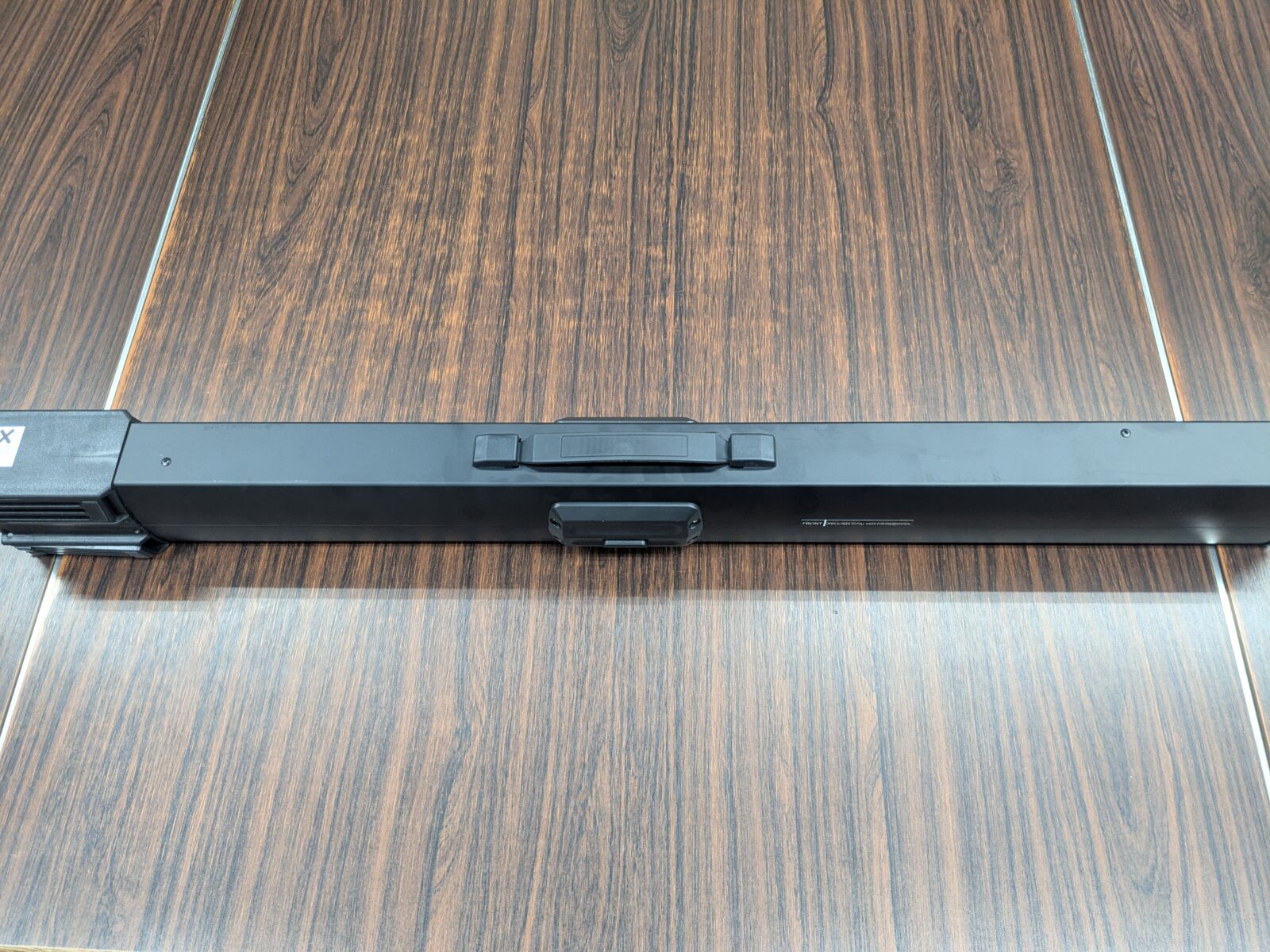 調べてみると、折り畳み式で持ち運び可能なプロジェクタースクリーンがあることを知りました。今回導入したスクリーンは、約50インチサイズ。収納すると驚くほどコンパクトで、展示会の荷物としても無理がありません。
