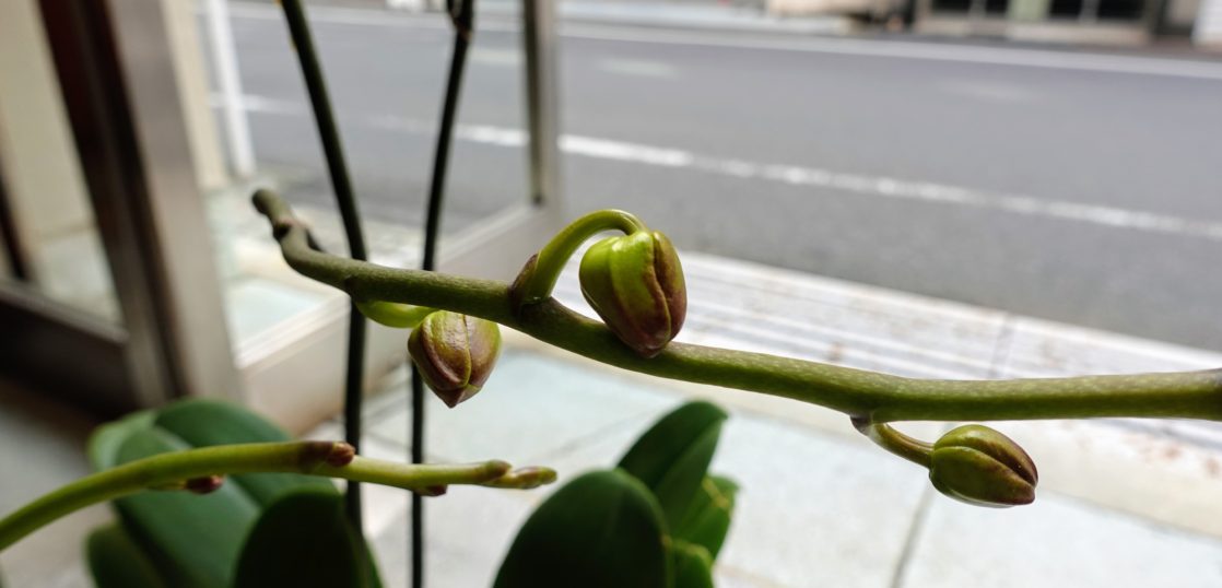 胡蝶蘭に蕾ができました! 2021年5月26日 marujo 昨年70周年記念でいただいた胡蝶蘭に蕾ができました。もうすぐ咲きそうで、何色の花が咲くか楽しみです。丸上の受付で育てていますが、ここは日当たりも良いので環境に恵まれているのだと思います。