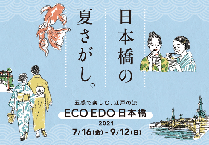 『ECO EDO 日本橋』では、江戸時代に日本橋で育まれた“涼”をとる生活の知恵や工夫を現代流にアレンジした様々なイベントを、街中で開催します。今年はコロナ禍での実施となるため、集合型ではなく、ひとつの場所に留まらない”街歩き”をメインコンテンツに据え、“日本橋の夏さがし”をテーマに、密を避けながら夏を感じる涼スポットやグルメ探しを楽しむ企画をご用意しました。
